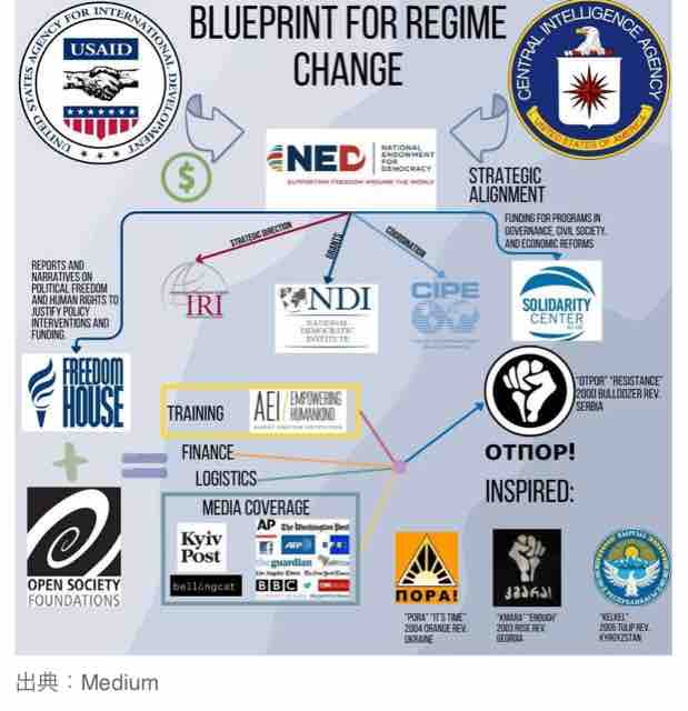 まず、NEDは英文全称はNational Endowment for Democracyの頭文字を取ったものだ。世界中に「アメリカ流民主主義」を流布させるために、それを実行していない国や政府があると、NEDスタッフを派遣して現地の民主主義志向団体を育成し、トレーニングを経て政府転覆の動きを助ける(煽る?)という働きをしてきた。詳細は拙著『習近平が狙う「米一極から多極化へ」 台湾有事を創り出すのはCIAだ!』の第六章で書いたが、この時はまだNEDという名前が知られていなかったので、NEDが「第二のCIA」と呼ばれていることから、「CIA」という単語によって「NED」を代表させていた。今ではかなり知られるようになったのは、ありがたいことだ。