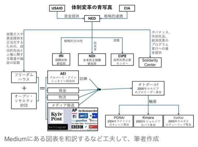 図表2の左端に書いた「政策介入や資金提供を正当化するための、政治的自由と人権に関する報道や論説の拡散」のための組織として「フリーダムハウス」やジョージ・ソロスが創立した「オープン・ソサエティ財団」がある。この二つの組織が左下に「=」で書いてある「訓練、資金、物流」以外にメディア報道をコントロールする。メディアのコントロールは、もちろん日本の隅々にまでわたっているので、NEDに関する情報を書くと、日本では「陰謀論者」として排除して、ファクトを見るのを避けようとする傾向にある。
